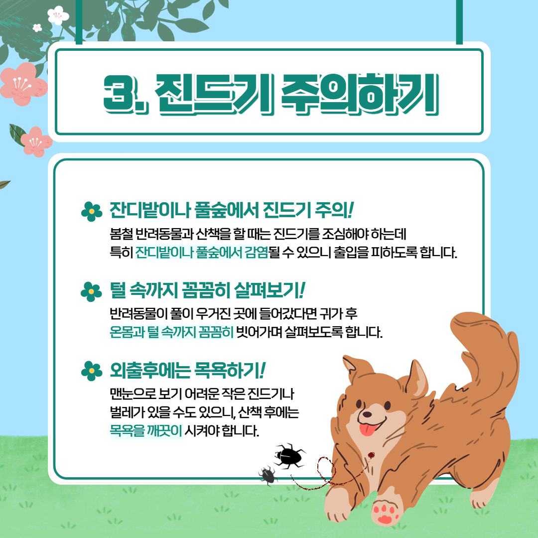 날씨가 풀리면 강아지 산책하는 시간이 길어지고, 횟수도 늘어나기 때문에 적절한 건강 관리를 통해 소중한 반려견을 지켜주세요.